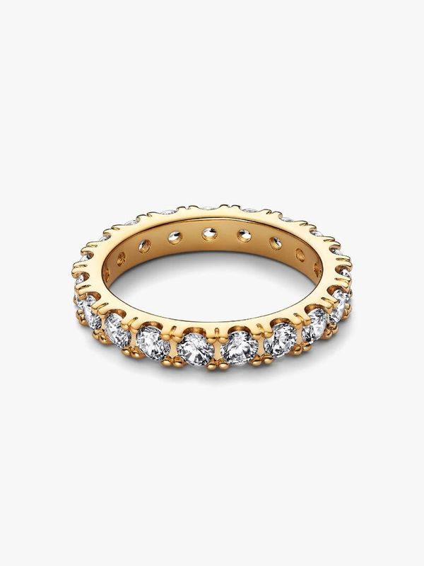 Make a classic statement with the Sparkling Row Eternity Ring. Hand-finished in 14k gold-plated sterling silver, this eternity ring features a band inlaid with sparkling clear cubic zirconia. The design looks equally bea
