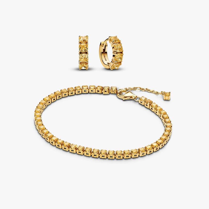 Channel sunshine with this sparkling bracelet and earring set, featuring vibrant yellow cubic zirconia and 14k gold-plating. Includes the Yellow Hoop Earrings and Sparkling Yellow Tennis Bracelet.