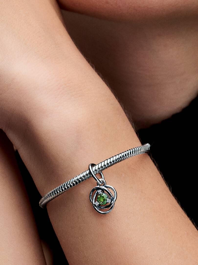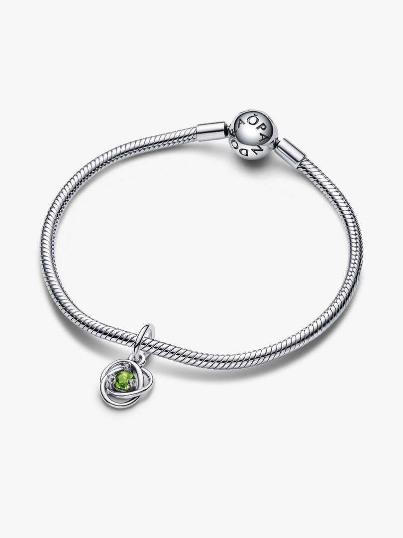 This intricate Spring Green Eternity Circle Dangle Charm is a must-have infinity charm for your brand Moments collection. Crafted in lustrous sterling silver, it features an openwork infinity braid decorated with a cen