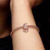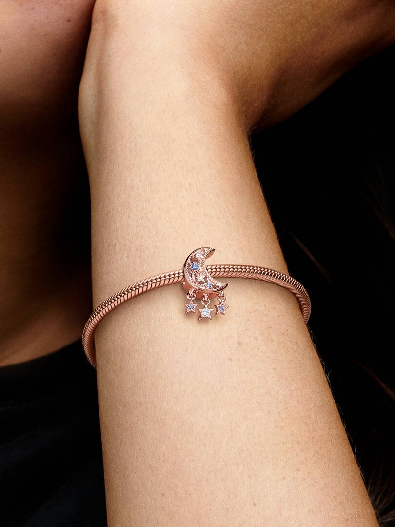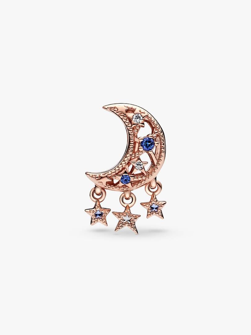 Add celestial sparkle to any look with the Star & Crescent Moon Charm. Finished in 14k rose gold plating, the charm has been carefully detailed by hand with rows of cubic zirconia and cut-out star and circle shapes. Micr