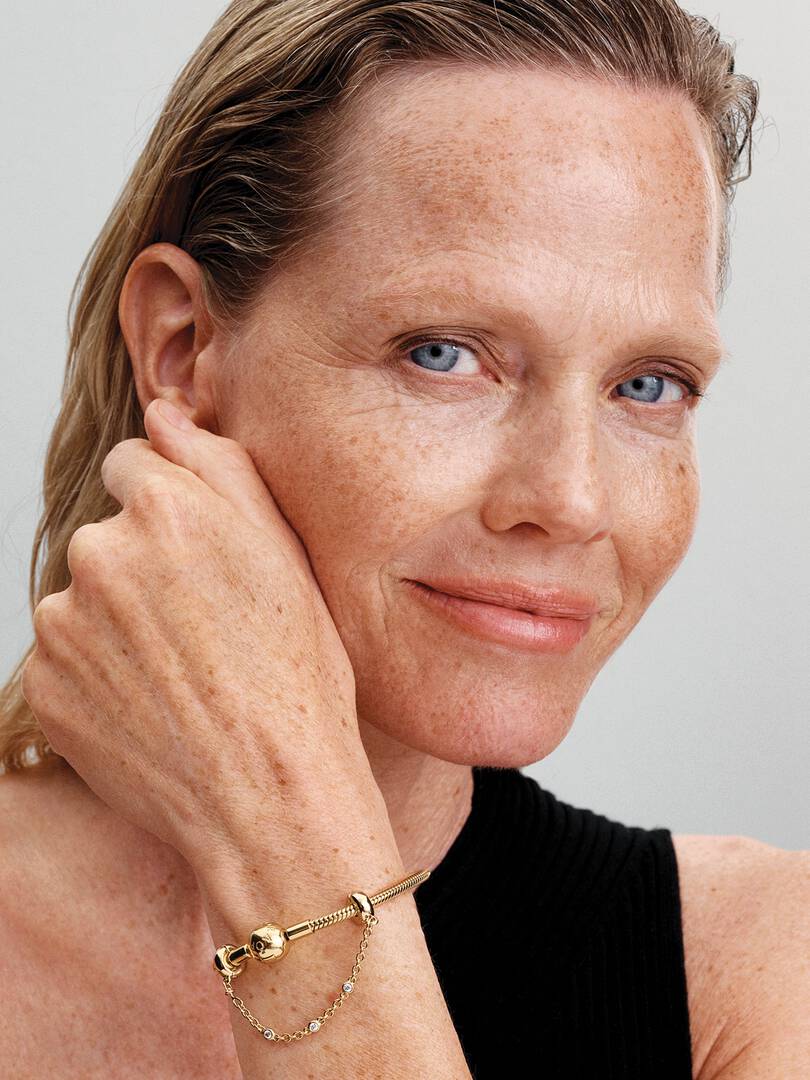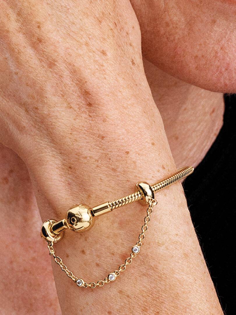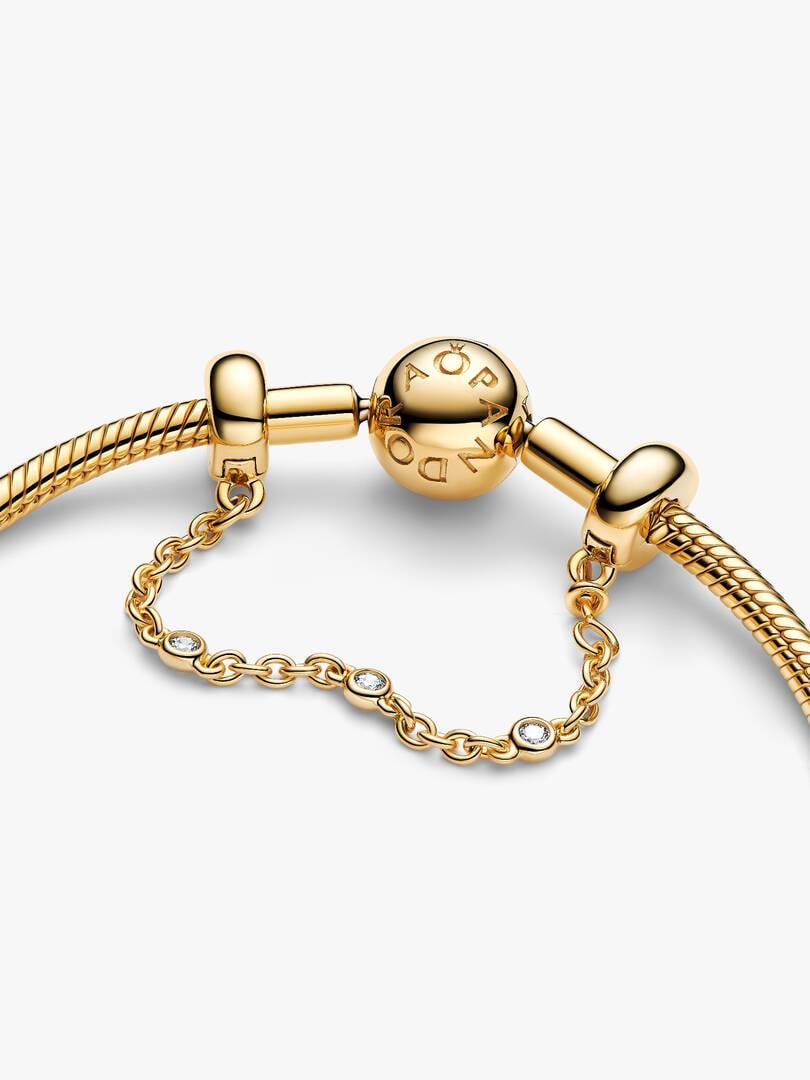 Keep your treasures safe with this 14k gold-plated safety chain. Each bail has threads inside to secure the charms on your brand Moments bracelet. It features three clear bezel-set stones on the chain to bring a touch