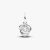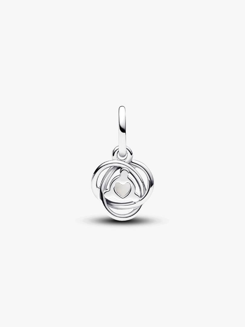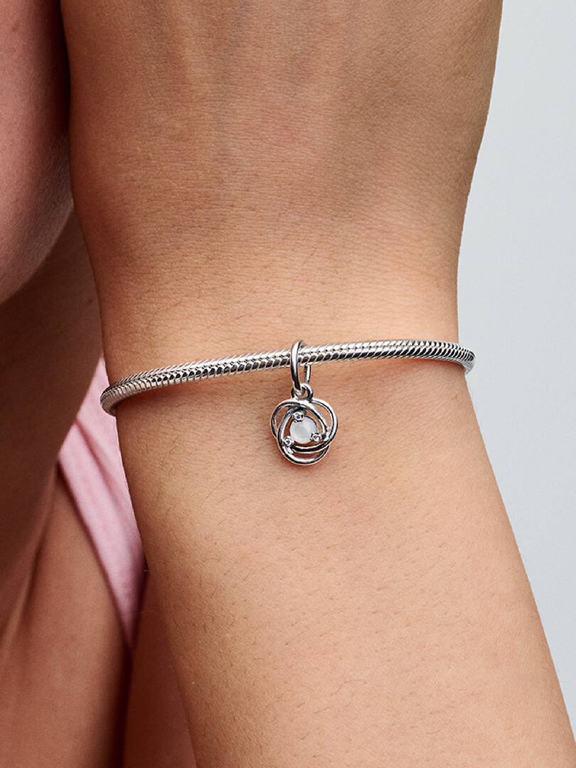 This intricate White Eternity Circle Dangle Charm is a must-have for your brand Moments collection. Crafted in lustrous sterling silver, it features an openwork infinity braid decorated with a central white bioresin ma