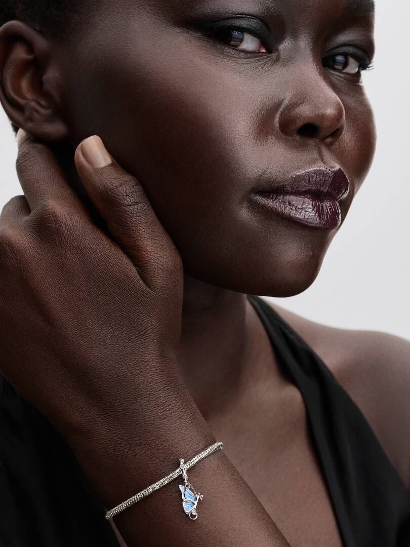 Unlock your dreams with our sterling silver Winged Dangle Charm. The butterfly’s head and body form a key. One wing has an openwork design, while the other features shimmering enamel and the engraved message ‘UNLOCK TOMO